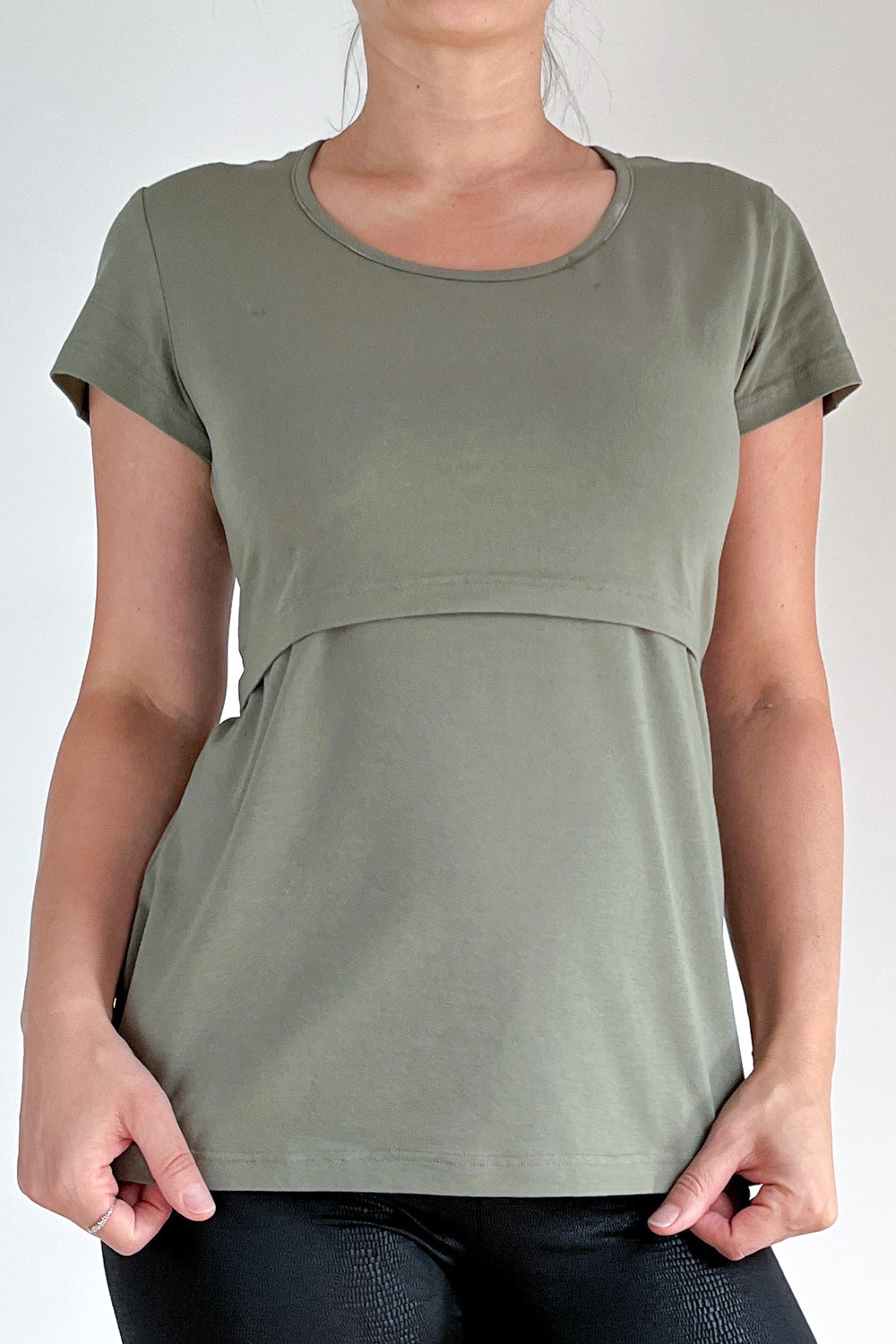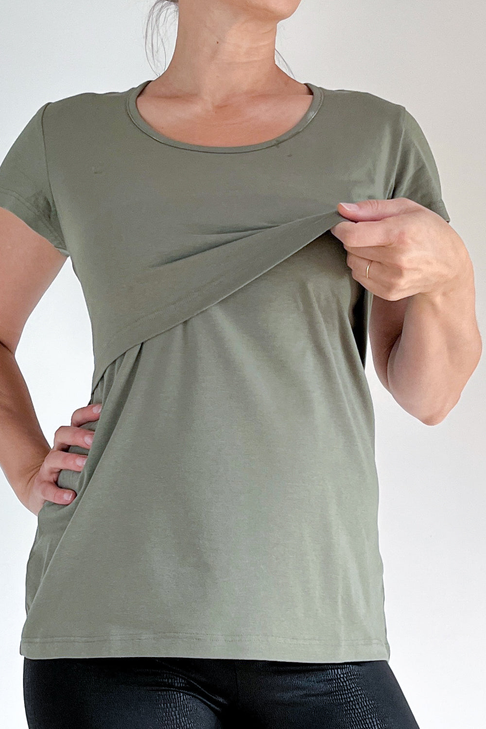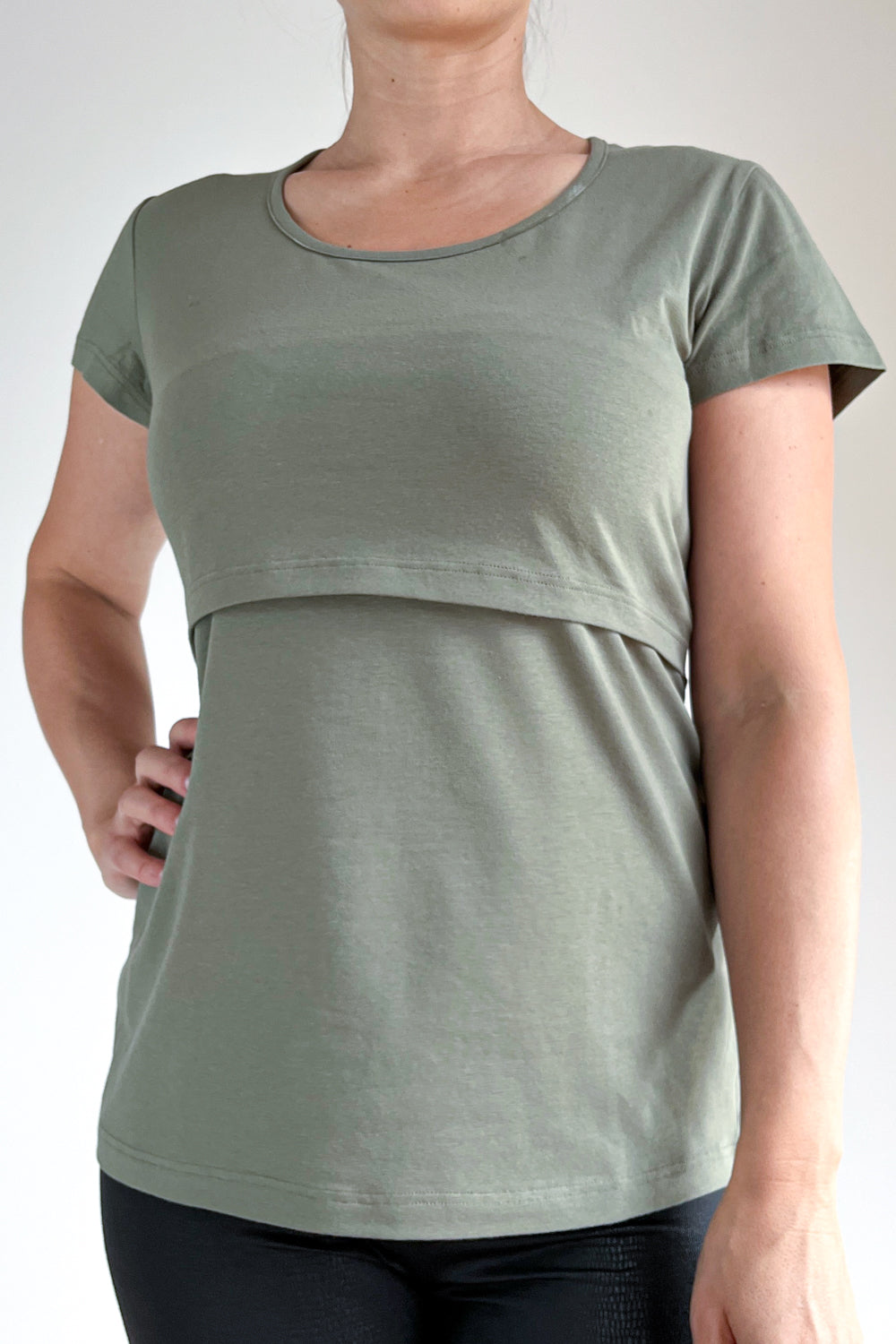 Majica za dojenje je narejena iz mehkega, zračnega in elastičnega bombaža v olivno zeleni barvi. Primerna je za nošenje vsak dan v času dojenja. Majica ti nudi prijeten občutek in hiter ter enostaven dosto do prsi.