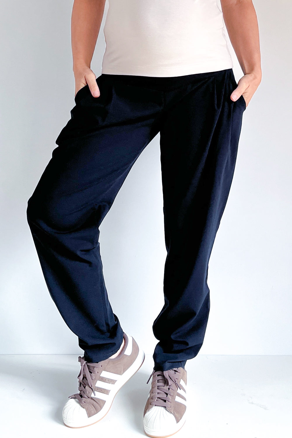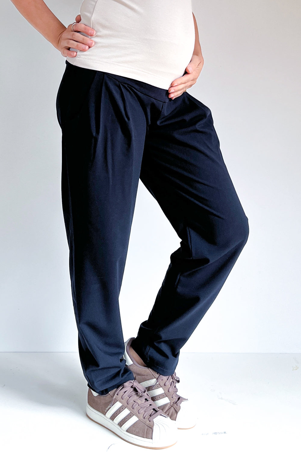 Nosečniške elegantne hlače so krojene širše pri bokih in ožje pri gležnjih, hlačnice se lepo, enakomerno ožajo navzdol. Hlačam sta dodani dve gubi za še bolj trendi videz in dva stranska žepa. So zelo udobne pri sedenju in hoji. Dolžina hlačnic do gležnjev optično podaljša noge.