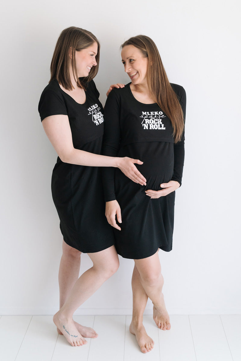 Spalna srajca za nosečnost in dojenje z napisom "Mleko Spanje in RockNroll" - dolg rokav - črna barva